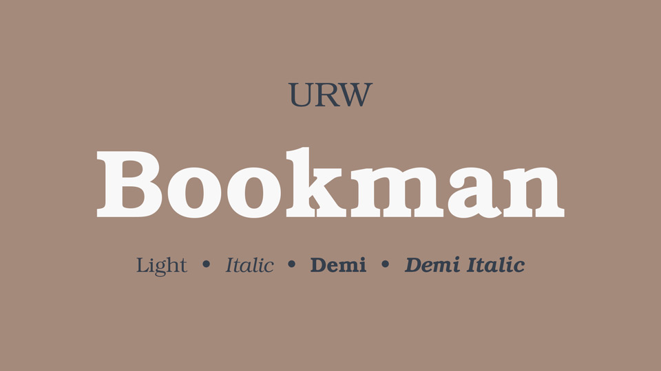 Bookman is a classic and highly legible serif typeface, renowned for its robust appearance, high x-height, and friendly, open letterforms. Ideal for both body text and prominent display use, it offers excellent readability and a timeless aesthetic across print and digital applications.