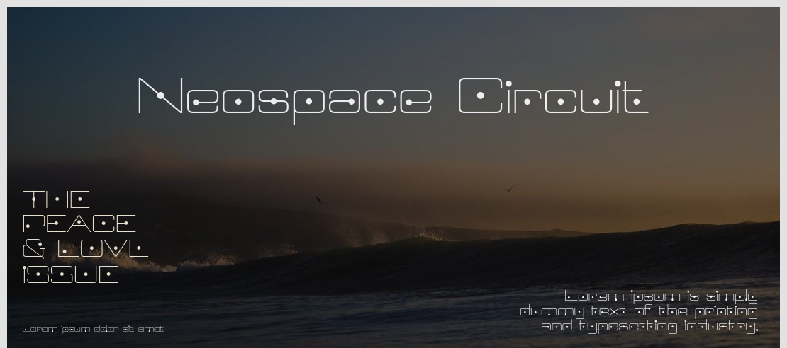 Neospace Circuit is a futuristic display font featuring a distinct circuit board aesthetic, perfect for sci-fi themes, technology branding, game interfaces, and digital projects. Its sharp, angular design evokes advanced tech and cyberpunk vibes.