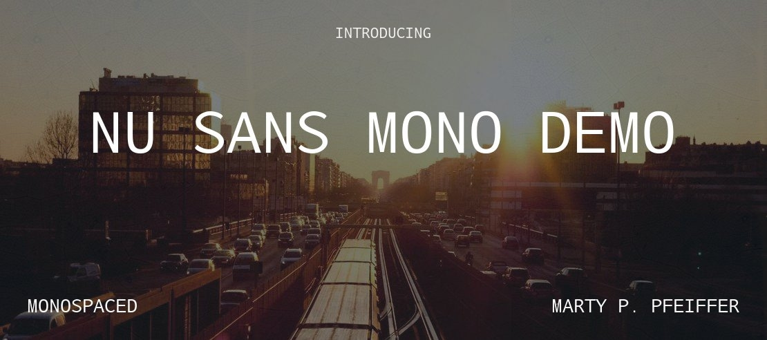 Nu Sans Mono Demo is a modern, clean geometric monospace font designed for optimal readability in coding, UI, and technical documentation. Its consistent character width and crisp lines make it ideal for developers and designers seeking a contemporary, highly legible fixed-width typeface.