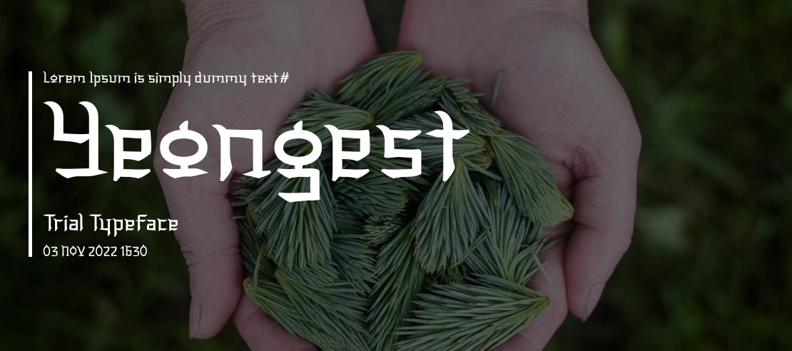 Yeongest Trial is a modern display serif font known for its bold and elegant design, ideal for creating impactful headlines, distinctive branding, and sophisticated editorial layouts. Its strong serifs and unique character ensure a memorable presence.